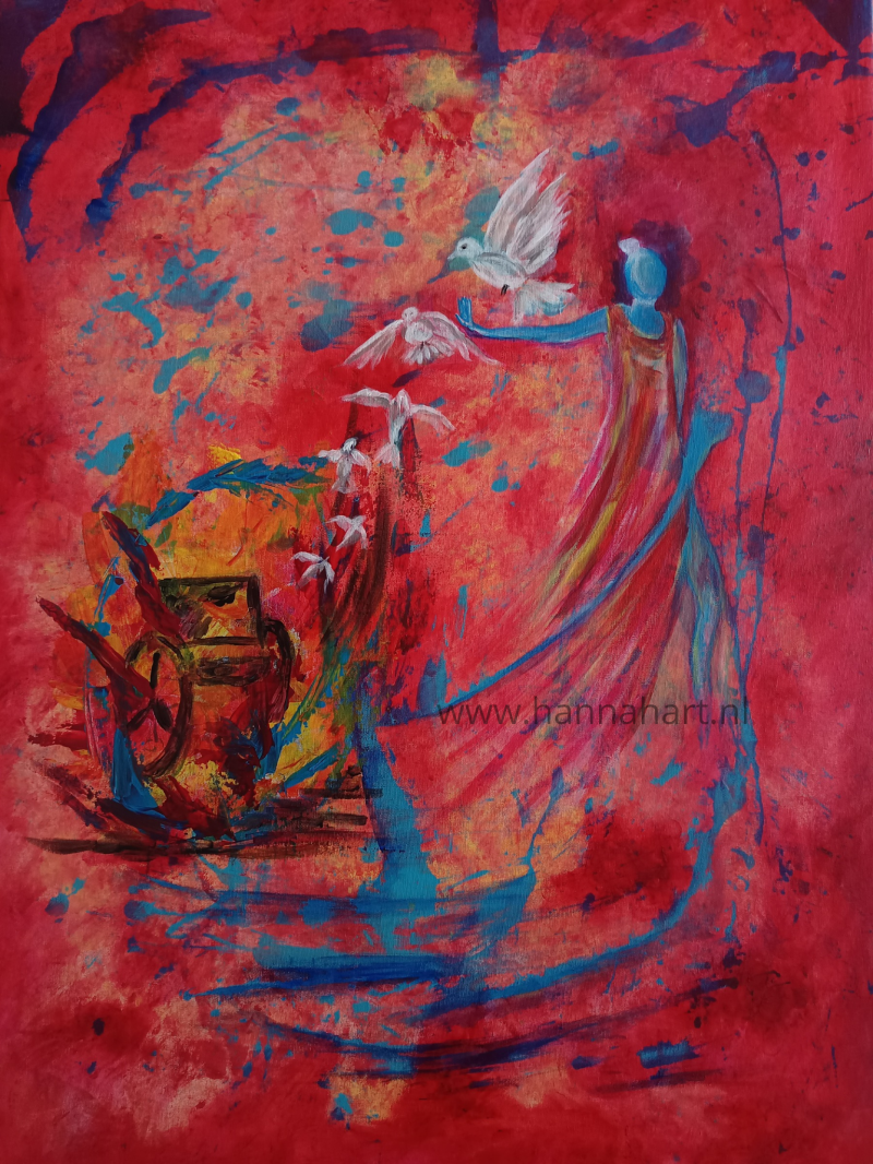 In het schilderij zie je duiven — symbool van vrede, van loslaten, van opstijgen. En tegelijk het beeld van de Heilige Geest, die heling aanraakt op plekken waar ik zelf niet bij kan.