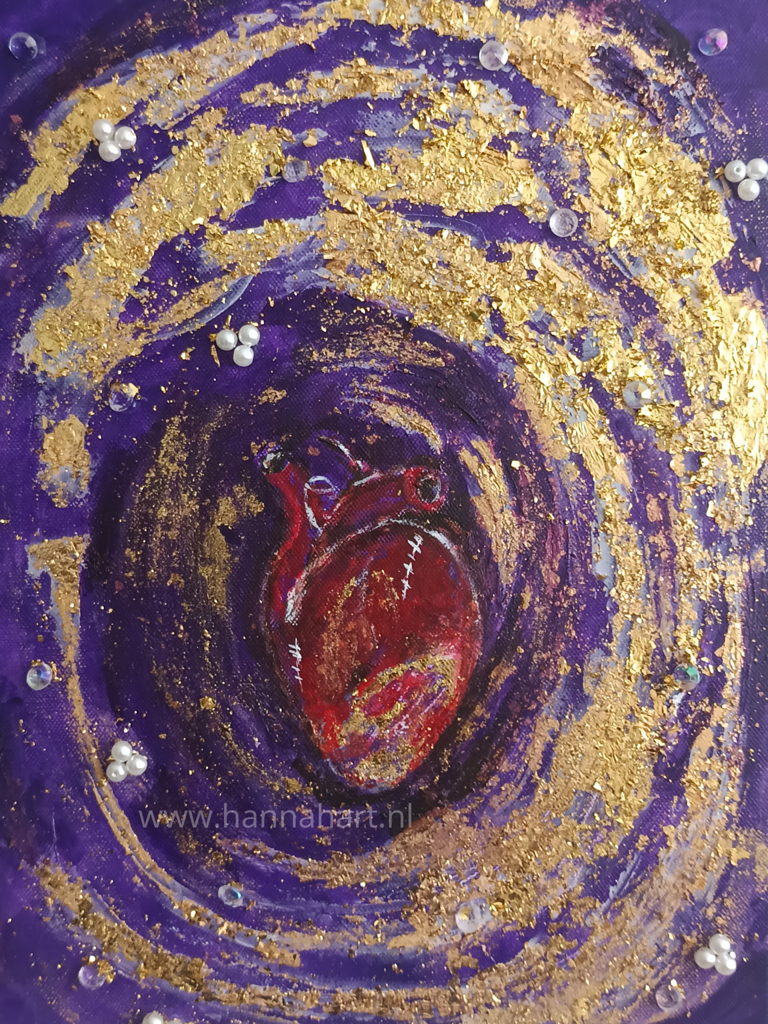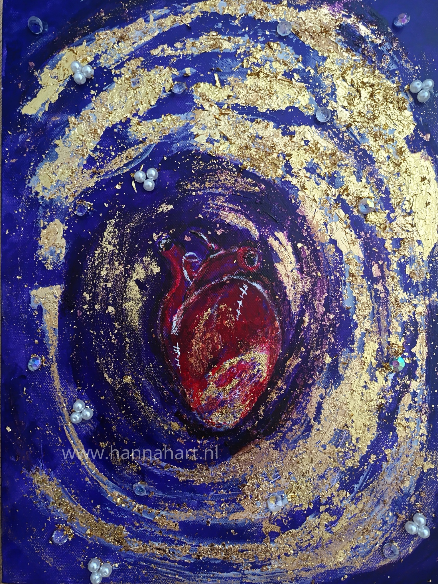 In het midden van dit kunstwerk klopt een hart. Beschadigd, gehecht, door het leven geraakt — maar nog steeds levend. Omringd door gouden glans, parels en licht.